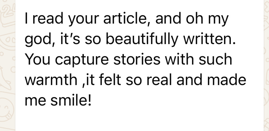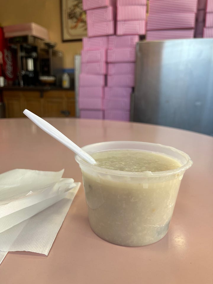 So, as I finagle this letter’s final version — on my phone, sitting cross-legged on one of those burgundy-colored high-backed chairs you’ll find at most Chinese restaurants (having just slurped down a scalding hot helping of porridge at the mom-and-pop shop my family has ordered takeout from for the past 25 years) — know that pressing “publish” on this vignette will feel somewhat like I’m concluding a weeks-long conversation with you.