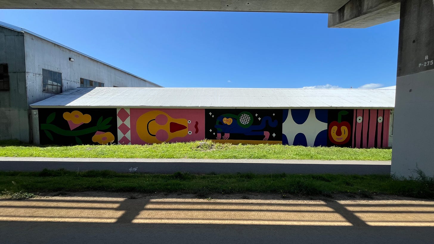 Jackie: This mural was inspired by the sporty element of being next to the bike or walk trail. I especially wanted to create something playful for this space, so that it could brighten up the mood of an otherwise drab warehouse exterior. The simplicity and bold colors of the mural are designed so that it can catch the eye of someone speeding by on a bike and have a positive, fun impact in what could be a microsecond.